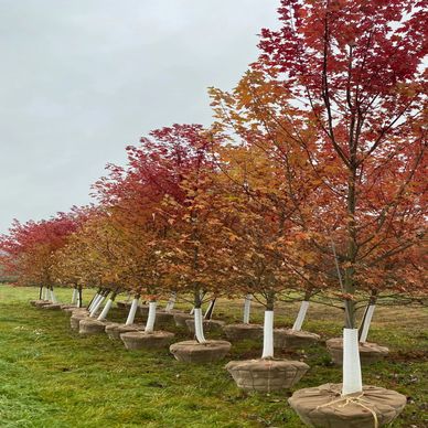 The 'Autumn Blaze' Maple is a hybrid tree with a cross between a red maple and a silver maple. This tree displays a vibrant bold red look in the fall and is fast-growing.